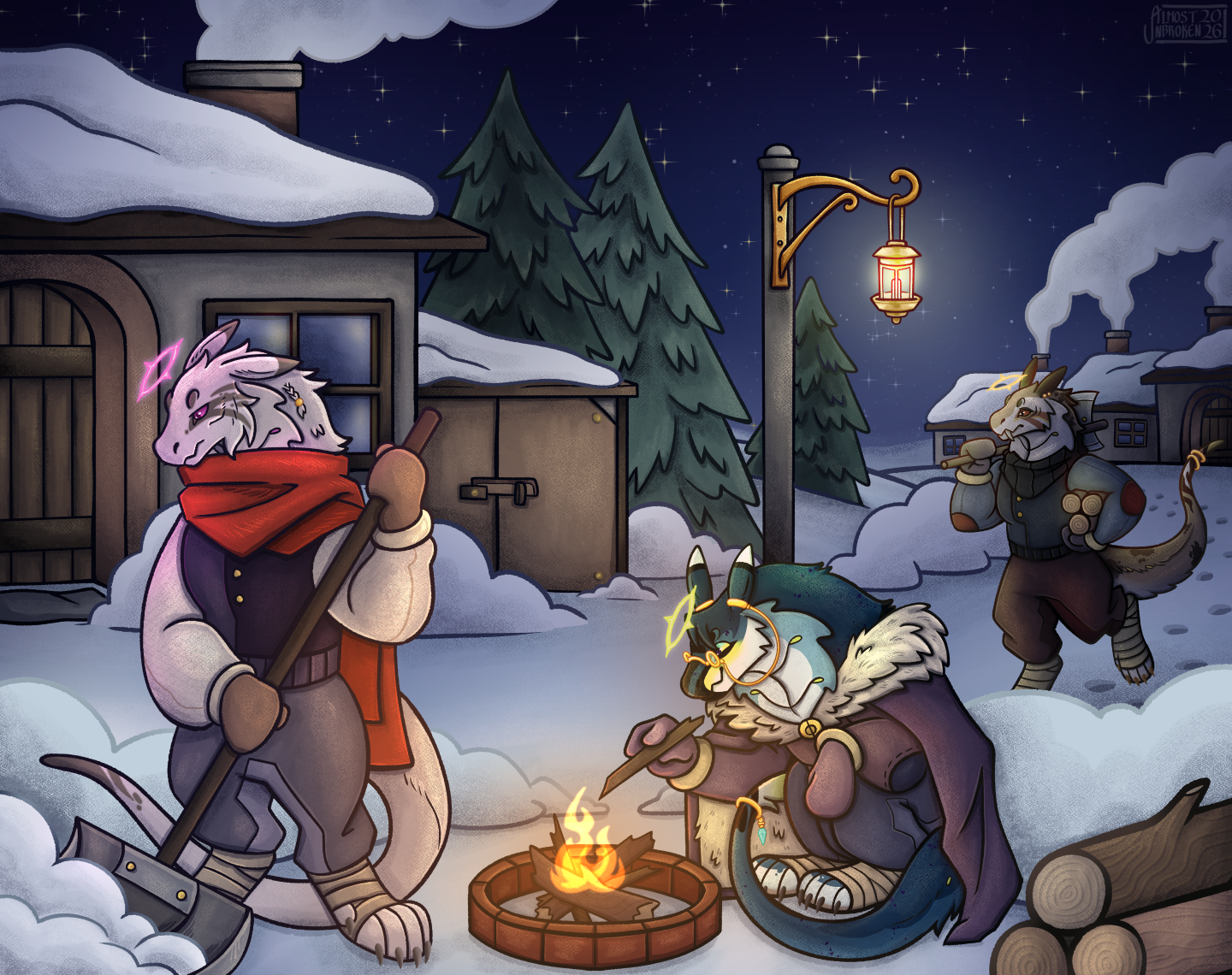 The two of them ate their meals in comfortable silence as the sky settled into dusk. They completed their evening routines at their own paces; Lyricist’s being much faster than Anna’s. The moment he curled up in the pile of soft pelts he had brought he was snoring away quietly. Anthracite did one last patrol around their camp before following suit in getting comfortable. However, she couldn’t follow Lyricist to sleep quite as easily.