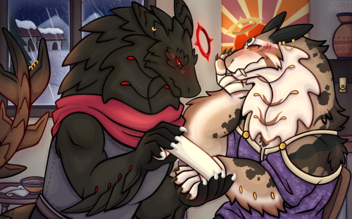 Lyricist stood up and brought the bowl to his friend; Anthracite sitting up in response. She took the bowl from him and smiled warmly. They were a good pair - Anthracite was a rex of few words, but Lyricist was one of many, and he seemed to always understand what she was thinking. He placed a paw on her arm and smiled back.