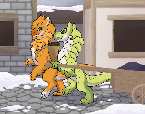 After a few minutes they pulled off the main path and came up to a house. It wasn’t grand by any means but it definitely belonged to a wealthier rex. The two rexes grinned, each pulled a container out of their bag and removed the lids and whipped them at the house. Brightly colored paint splattered out onto the outside of the house. They both laughed then Auratus shushed Lemo. “Shh, you're going to get us caught.”